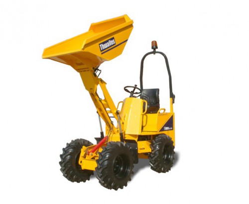 Este dúmper de obra, THWAITES Mach.201, articulado y 4x4 es el más pequeño y estrecho de toda la gama. Con una tolva de 1 tonelada de capacidad de carga permite realizar las tareas de carga y descarga en los lugares más inaccesibles gracias a su descarga alta y frontal y a su estrechez total de 1,15 metros. Con dirección asistida y transmisión hidrostática su manejabilidad es tan eficaz como segura. Está unidad está matriculada y puede circular por la vía pública.
