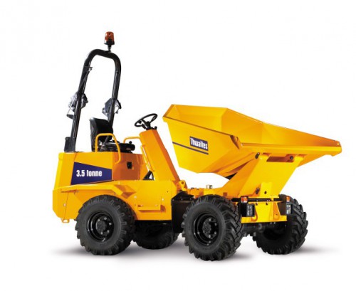 Este dúmper de obra, THWAITES Mach.474, es articulado y con tracción 4x4. Está provisto de una tolva de 3,5 toneladas de capacidad de carga. Facilita el trabajo en los terrenos más reducidos, gracias a su descarga giratoria y a su cómoda maniobrabilidad, con dirección asistida y transmisión hidrostática. Está unidad está matriculada y puede circular por la vía pública.