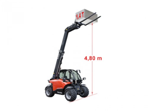 Este manipulador telescópico, KUBOTA KTH4815, es una máquina muy compacta gracias a su anchura y su altura, ambas inferiores a 2 metros. Estas medidas permiten utilizarla en espacios reducidos con la máxima comodidad gracias a su dirección articulada. Esta máquina aporta sus mejores ventajas tanto en la construcción con en el ámbito agrícola, consta de tres accesorios: un juego de pinzas porta palets, una pala y una horquilla agrícola. Está unidad está matriculada y puede circular por la vía pública.