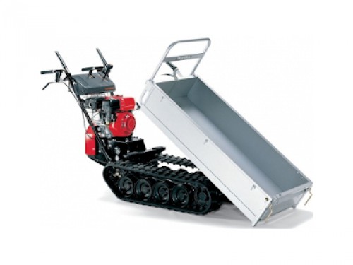 Esta transportadora, HONDA HP500, es una carretilla con tracción mecánica mediante orugas de goma para su uso en cualquier terreno, bien sea asfaltado o de difícil acceso como son los caminos forestales o las playas. Dispone de una tolva de carga muy polivalente, que puede extenderse tanto en anchura como en longitud para adaptarse a las diferentes necesidades de la carga, en el ámbito de la construcción o de la jardinería en general. Cuenta con un sistema de desbloqueo que le permite realizar giros con solo una de las orugas sobre sí misma para acceder a zonas estrechas y dispone de una palanca manual para accionar sin esfuerzo la descarga de la tolva. Esta carretilla todo terreno dispone de un embrague de seguridad que actúa al soltar las manetas de dirección del manillar y detiene su avance sin parar el motor. Es capaz de detenerse incluso en pendientes, poniendo siempre por delante la seguridad del operador. Este modelo incluye una transmisión hidrostática que le permite ajustar la velocidad de forma variable, adaptándola a las necesidades de su uso.