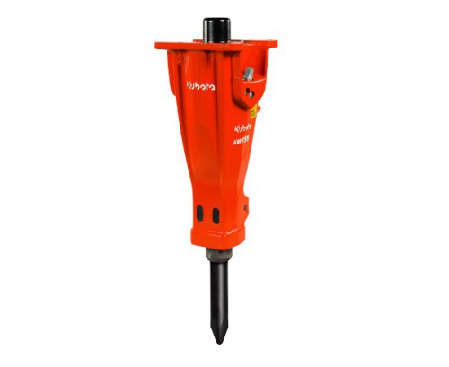 Martillo rompedor hidráulico, KUBOTA KM155, de 162 kilos, diseñado para su uso con miniexcavadoras de unos 2.000 a 3.000 kilos de peso. Con una frecuencia de impacto máxima de 1.750 golpes por minuto y equipado con una pica de Ø 50 milímetros.