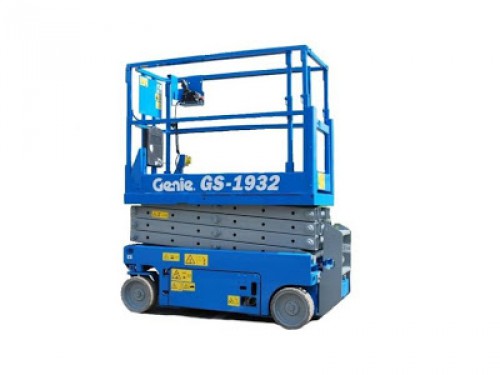 Este elevador, GENIE GS-1932, es muy versátil en la ejecución de tareas de construcción, mantenimiento e instalación de elementos tanto en el interior como al aire libre, sobre superficies firmes y niveladas. Tiene una plataforma estrecha, aunque espaciosa y estable, en la que se puede trabajar con comodidad y con total seguridad. Esta máquina incorpora neumáticos de goma que no dejan marcas en el suelo y su funcionamiento es mediante energía eléctrica limpia y eficiente.