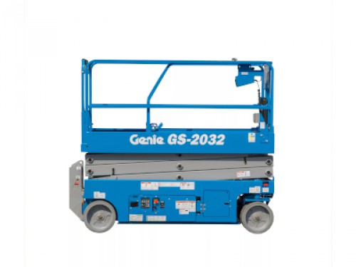 Este elevador, GENIE GS-2032, es muy versátil en la ejecución de tareas de construcción, mantenimiento e instalación de elementos tanto en el interior como al aire libre, sobre superficies firmes y niveladas. Tiene una plataforma estrecha, aunque espaciosa y estable, en la que se puede trabajar con comodidad y con total seguridad. Esta máquina incorpora neumáticos de goma que no dejan marcas en el suelo y su funcionamiento es mediante energía eléctrica limpia y eficiente.