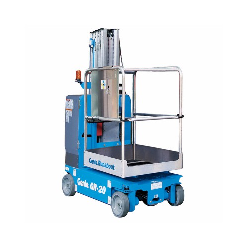 Este elevador vertical eléctrico, GENIE GR-20, es una máquina compacta y de bajo peso. Su reducido tamaño le permite pasar por puertas estándar y entrar en la mayoría de los ascensores de personas. Sus características principales son el radio de giro interior cero y la posibilidad de conducción en elevación total, que le convierten en un elevador ideal para tareas de almacenamiento, transporte, gestión de inventario y mantenimiento general. Esta plataforma vertical incorpora neumáticos de goma que no dejan marcas en el suelo y su funcionamiento es mediante energía eléctrica limpia y eficiente.